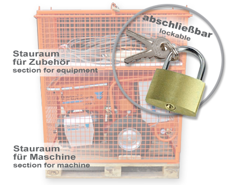 Die Transportgitterbox bietet neben dem eigentlichen Stauraum für die Maschine selbst,