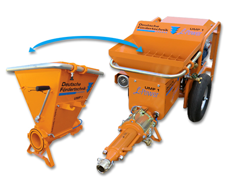 The material container standard for UMP 1 L-Power series is an additional accessory equipment for the clay plaster machine and multifunctional mixing pumps UMP 1 L-Power and L-Power dual. It enables a multifunctional usage of the L-Power-series. With exchanging the material container for clay against the material container standard version it will be possible to work with any kind of conventional construction material with one and the same machine.